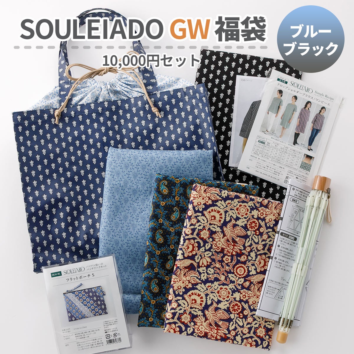 他の画像を見る ゴールデンウイーク特別企画 【数量限定福袋】SOULEIADO 2026 GWハッピーバッグフラットトート&生地・材料セット ブルーブラック系 3000円セット ¥ 3,300 税込 カートに入れる お気に入りに登録する