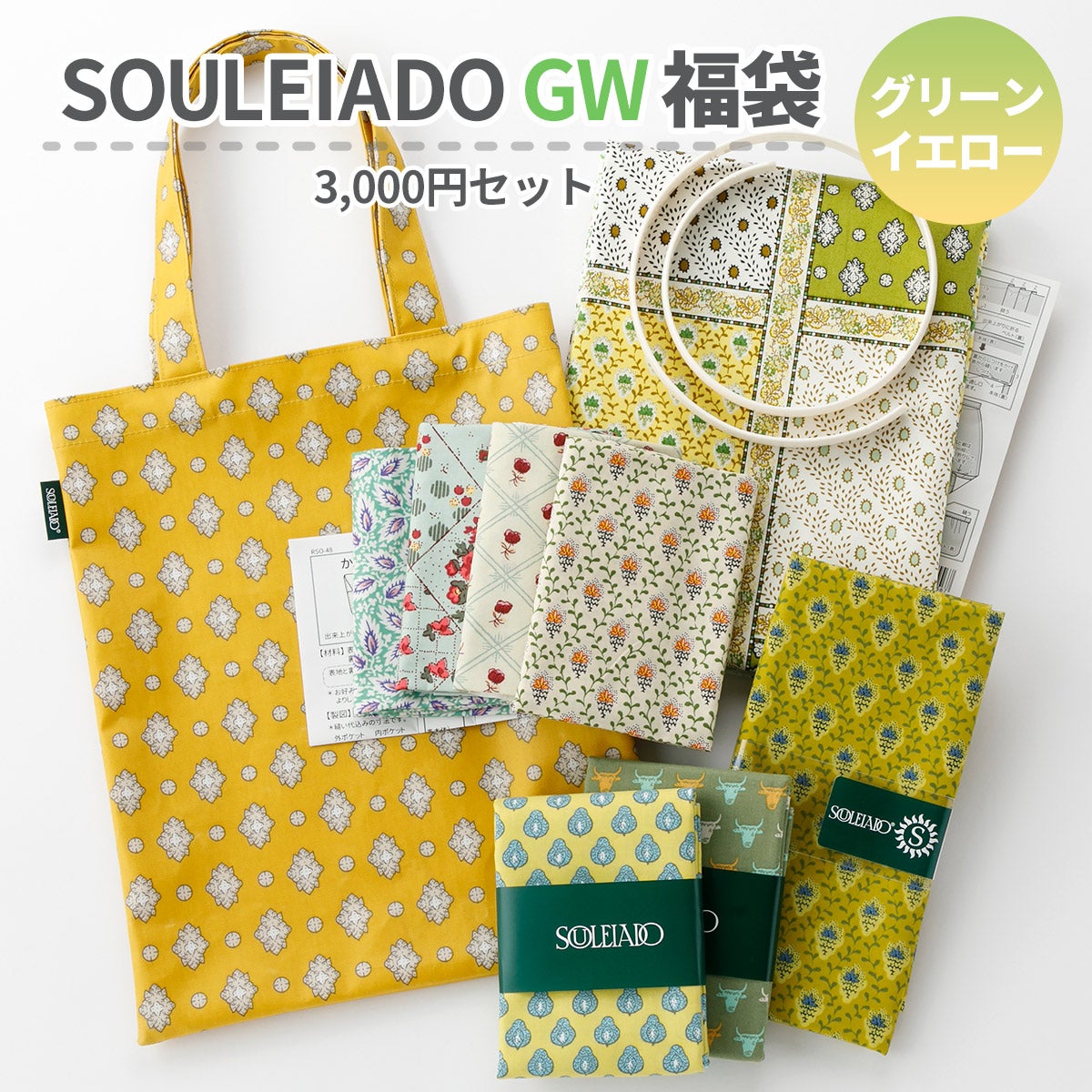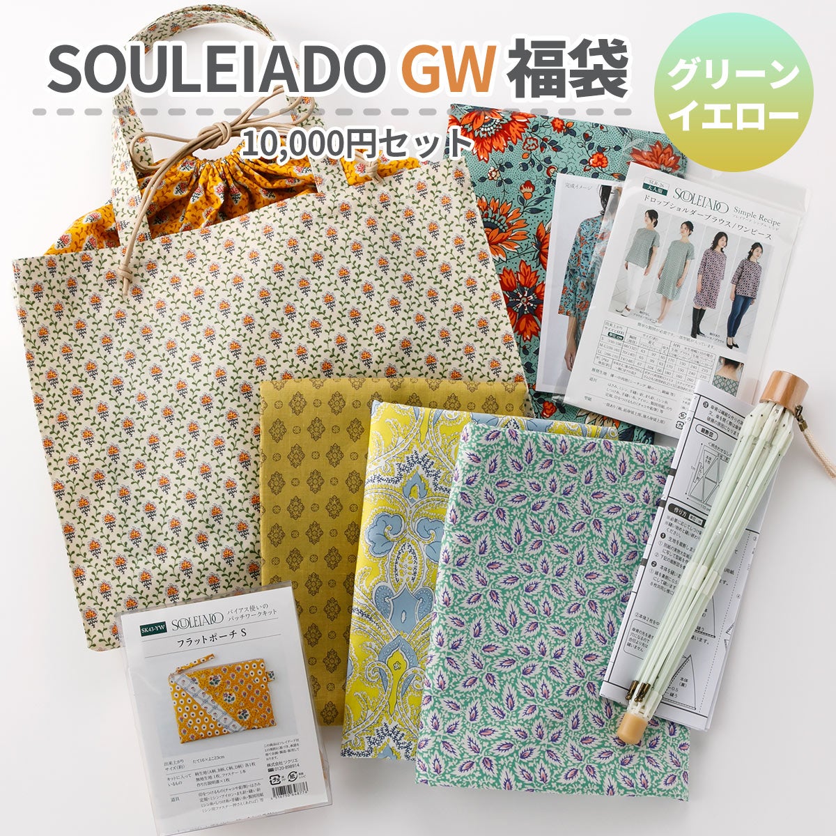 他の画像を見る ゴールデンウイーク特別企画 【数量限定福袋】SOULEIADO 2026 GWハッピーバッグ口布バッグ&生地・材料セット グリーンイエロー系 10000円セット ¥ 11,000 税込 カートに入れる お気に入りに登録する