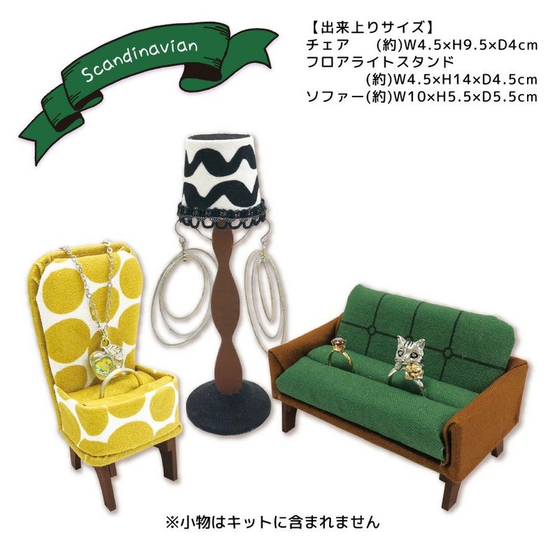 〇所要時間…約280分(目安です) 〇出来上がりサイズ…チェア/約W4.5×Hさ9.5×D4cm ライトスタンド/約W4.5×H14×D4.5㎝ ソファー/約W10×H5.5×D5.5㎝ 〇素材…木・紙・ウレタン・綿・ポリエステル