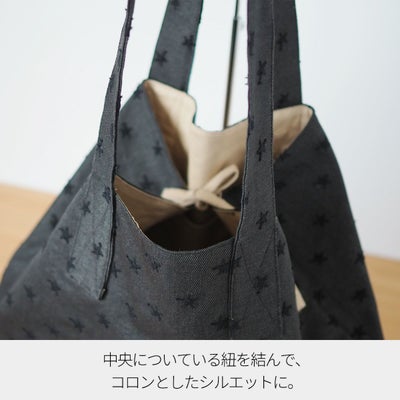 口部分の両端にひもが付いていて、結ぶとおにぎり型になってかわいいシルエットになります。