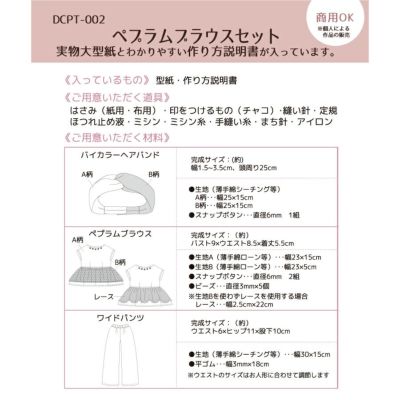 ペプラムブラウス、バイカラーヘアバンド、ワイドパンツの3点のパターンと作り方が入っています。