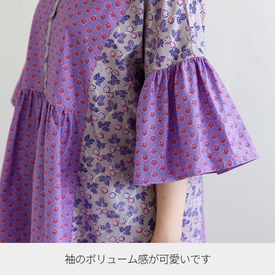 肘が隠れるくらいのフレアスリーブ。袖口にギャザーをたっぷりと使い、ふんわりとしたボリューム感がかわいらしいデザインです。