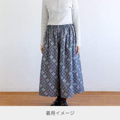足を閉じればスカートのようにも見えるゆったりシルエットで、足のラインを拾いにくいデザイン。